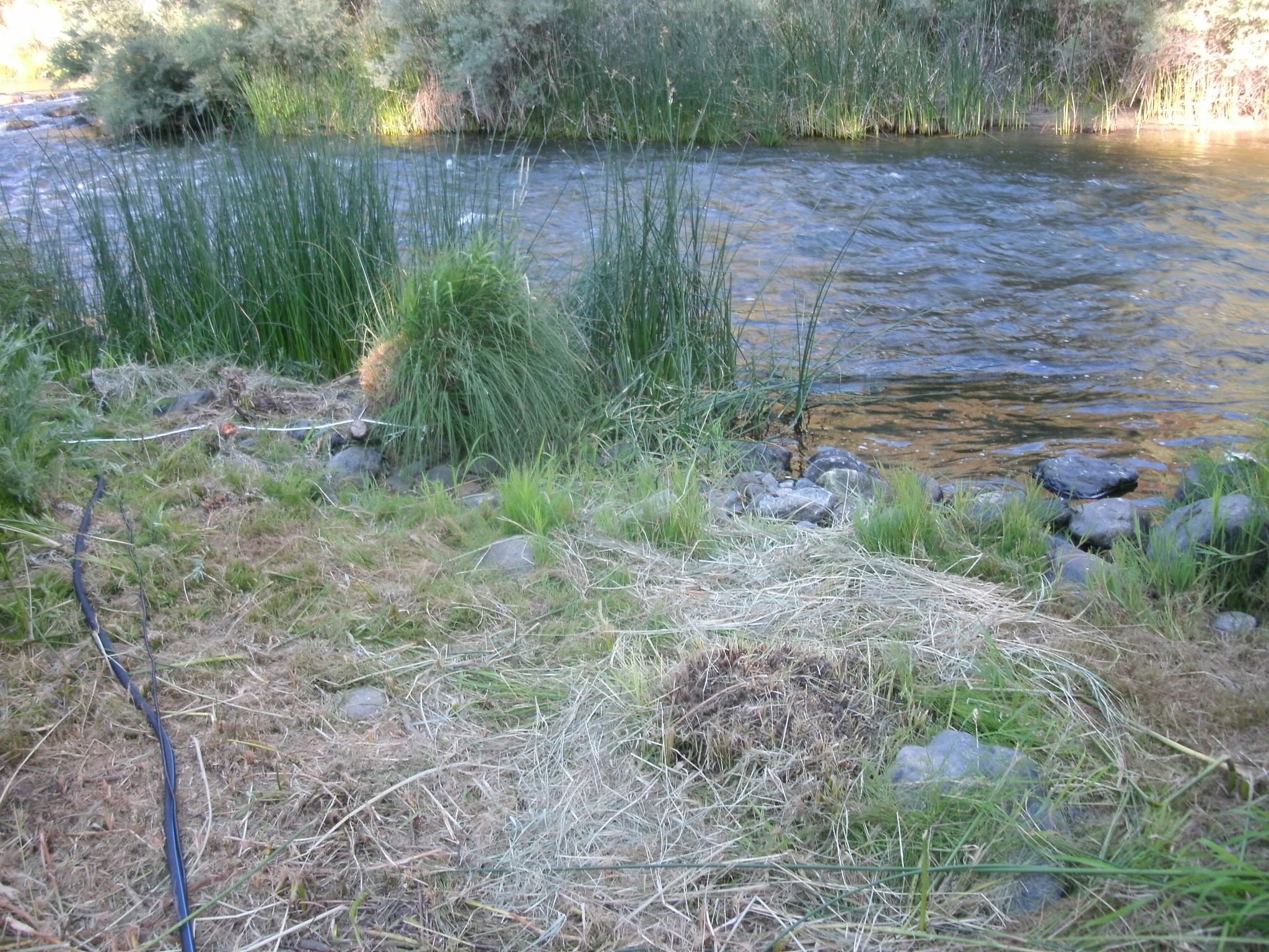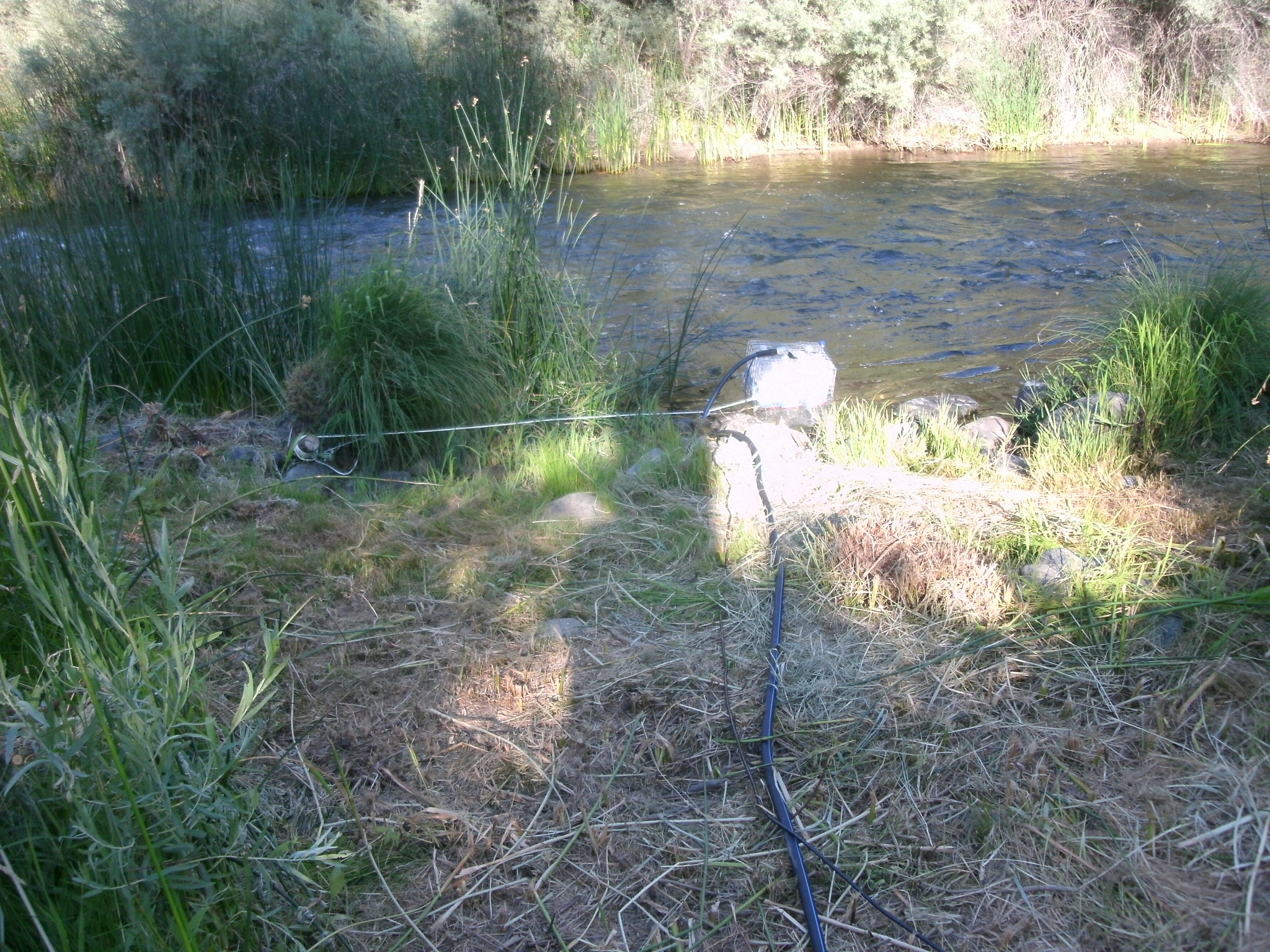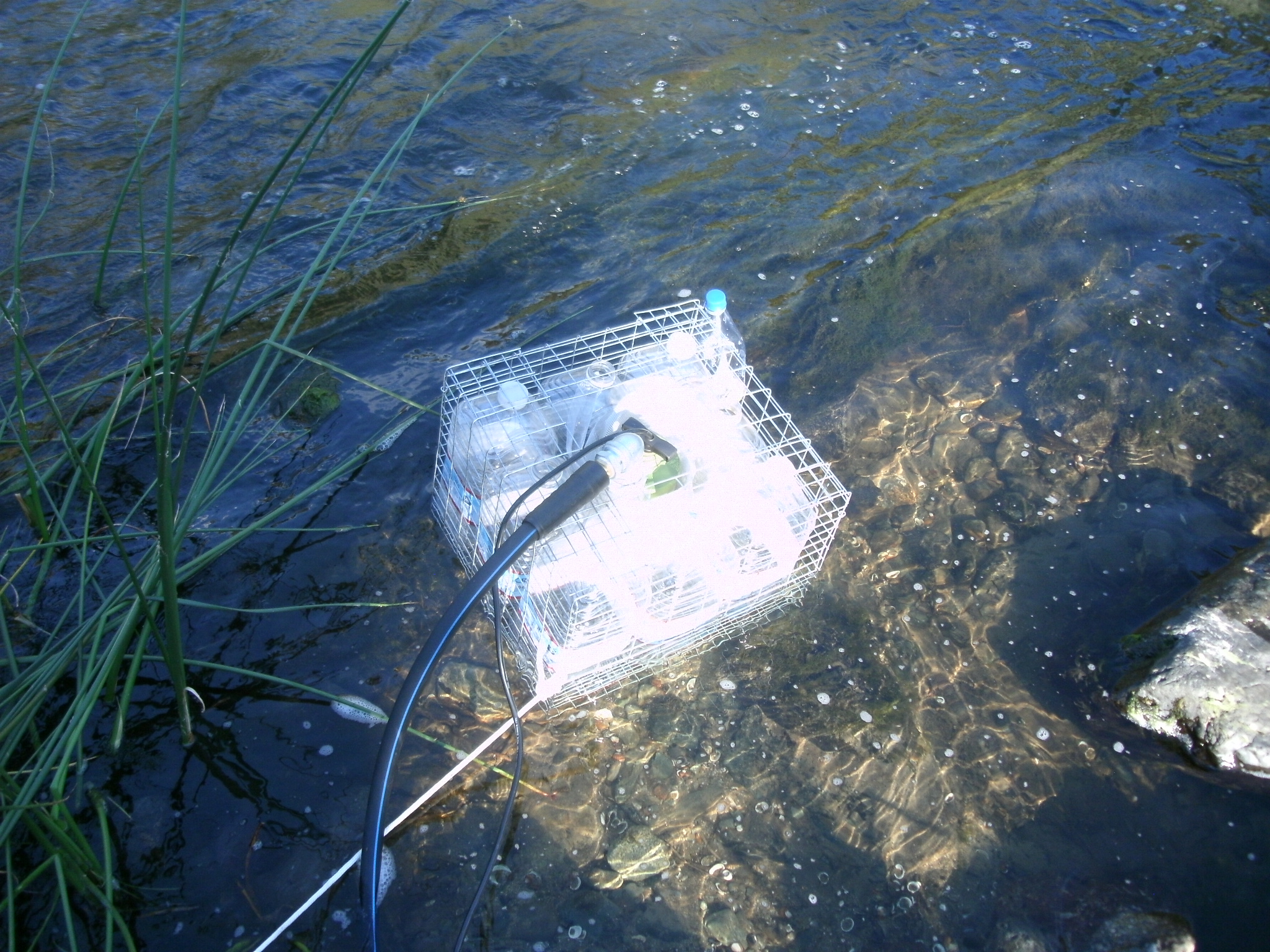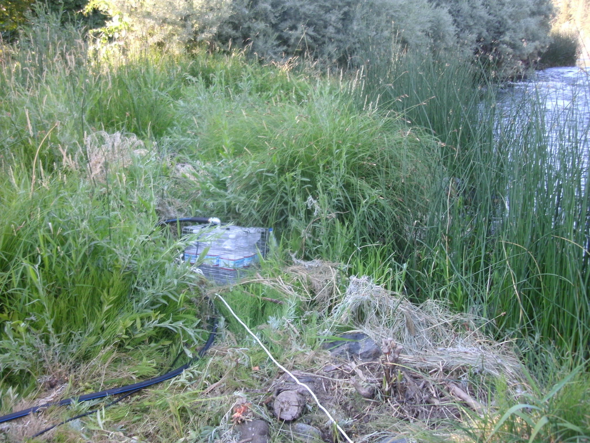 Pump in the river. Problem of cage tilting because of hose weight solved by attaching a small bottle of water to the opposite end of the cage as a counterweight.