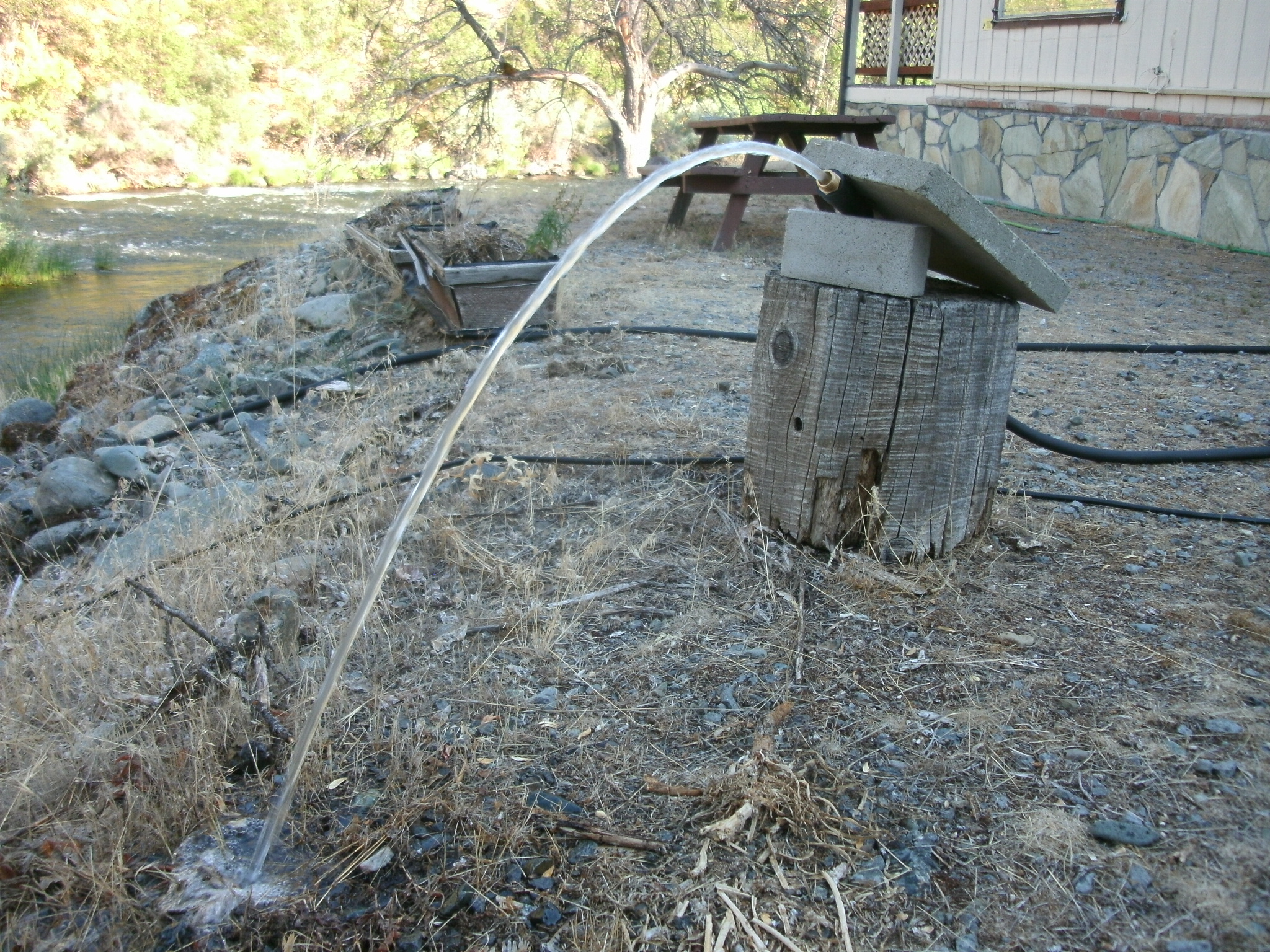 A better photo of the water being pumped up to house level. I tested twice that it fills a gallon bottle in 14 seconds, which equals slightly more than 4 gallons per minute, more would be better, but it is fine for normal household use, and much better than zero.